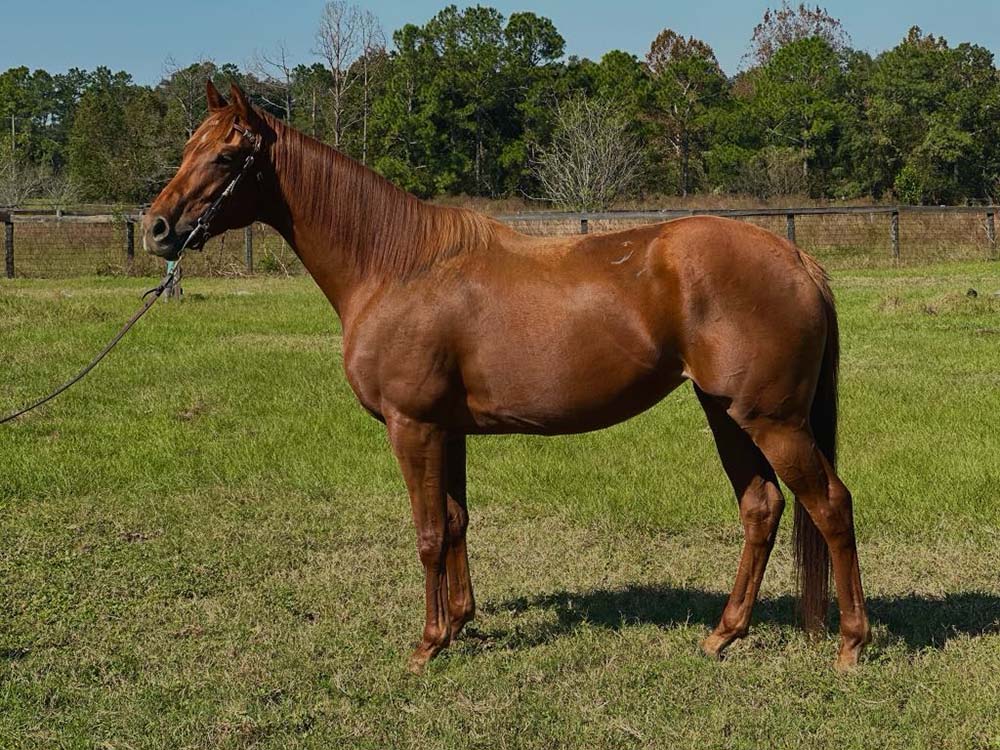 Gem is a 5-year-old chestnut Thoroughbred filly standing 15.3 hands tall. She has not been restarted under saddle yet, but she’s incredibly easy to handle and enjoys attention—always happy to come in, be brushed, and loved on. Gem is an easy keeper with a calm, friendly demeanor, making her a great candidate for trail riding or a western/ranch prospect. She is eligible for the FLTB Expo Restricted Division, offering a unique opportunity for someone looking to bring along a sweet and willing partner. While her limitations under saddle are currently unknown, she does have arthritis in her left front pastern due to a past injury. Gem would thrive in a home that appreciates her gentle nature and is looking for a horse to enjoy light riding or companionship.