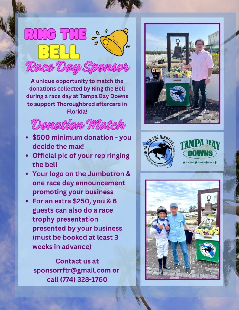 The Ring the Bell Initiative came to Tampa Bay Downs in 2023. This program enables owners, trainers, and even the jockeys to donate directly from the winner’s circle to aftercare. The funds raised through the Ring the Bell program enabled Run for the Ribbons to support 30 horses retiring from racing at Tampa Bay Downs during the past 2 meets. (will have to be updated annually) We hope to see you in the winner’s circle at the upcoming meet and look forward to hearing you ring the bell, but if you can’t make it in person or just want to contribute to the cause, consider ringing our virtual bell today!